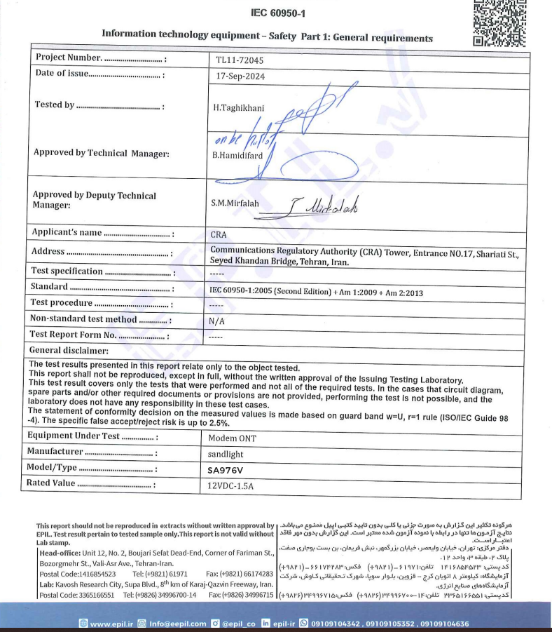تائیدیه های مودم های فیبر نوری Sandlight از مراجع مختلف اخذ گردیده و در این صفحه قابل دسترسی است.