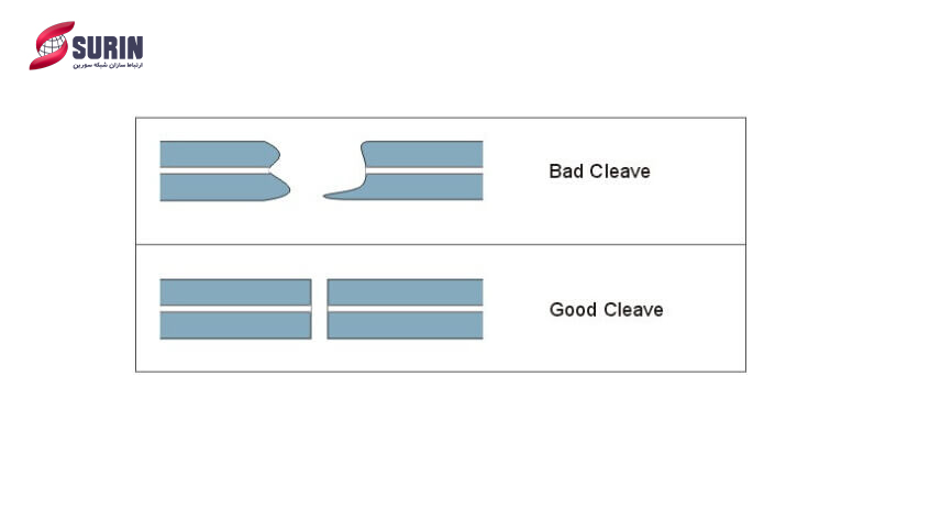 برش یا Cleaving به معنای قطع کردن نیست. همانطور که از نامش پیداست، این کار شامل ایجاد یک خط خراش (Scoring) بر روی فیبر با استفاده از دستگاه Cleaver و سپس کشیدن یا خم کردن آن تا زمانی است که شکسته شود. انتهای شکستهشده باید کاملاً صاف، آینهای و عمود بر محور فیبر باشد تا یک اسپلایس مناسب حاصل شود.
